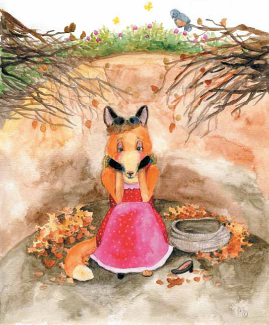 Лиса могла бы разгадать их замысел и унести последних птенцов. Но лиса была модница. Чёрными очками прикрывала свои хитрые глазки, ходила в туфельках на высоких каблучках. И по неосторожности, всё-таки, попалась в одну из ловушек. Сидит в яме лиса, плачет-горюет: