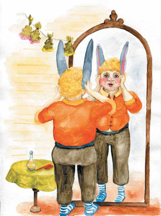 Принесли друзья ему целую корзину волшебных яблочек. Съел жадный Колыван их. И выросли у него уши, как у осла. Глянул в зеркало Колыван, испугался: