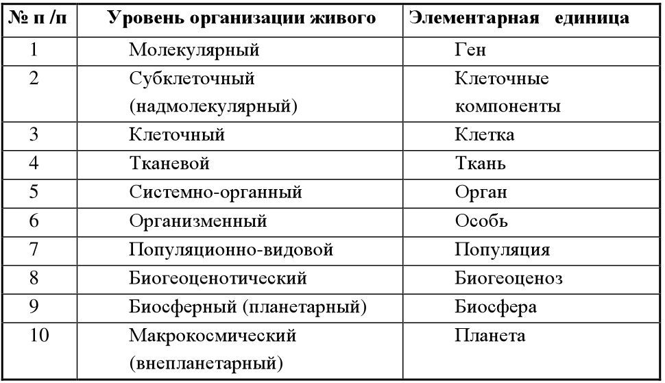 2. Уровни организации живой материиК 60-м годам XX века в биологической науке сложилось представление о структурности живой материи. Живое на нашей планете представлено в виде отдельных дискретных единиц, т.е. организмов, особей. Каждый живой организм, с одной стороны, состоит из единиц, подчиненных ему уровней организации, а с другой – сам является единицей, входящей в состав надорганизменных биологических макросистем (популяции, биогеоценозы, биосфера в целом). Существование жизни на всех уровнях подготавливается и определяется структурой низшего уровня. Отмечается большое сходство дискретны единиц на низших уровнях и все возрастающее различие на высших уровнях. На каждом уровне можно выделить элементарную единицу, т.е. структуру, изменения которой составляют на соответствующем уровне содержание эволюционного процесса.