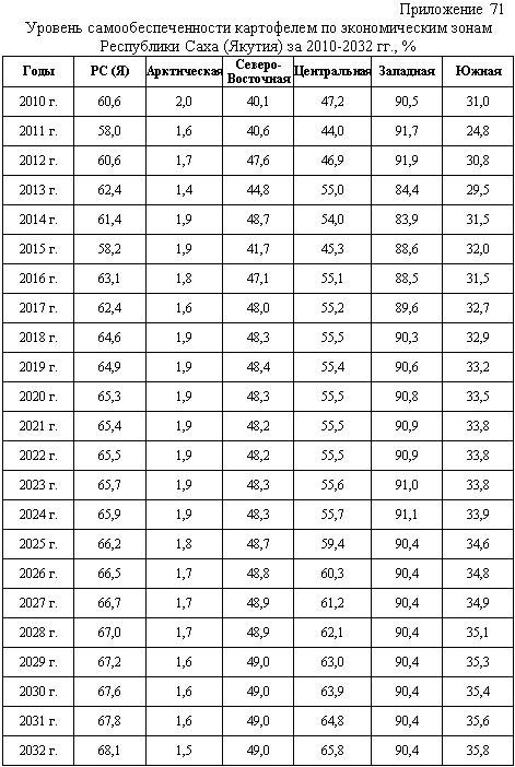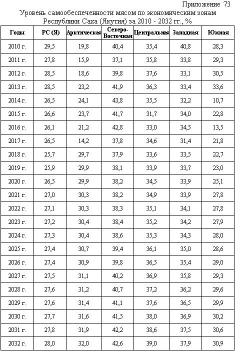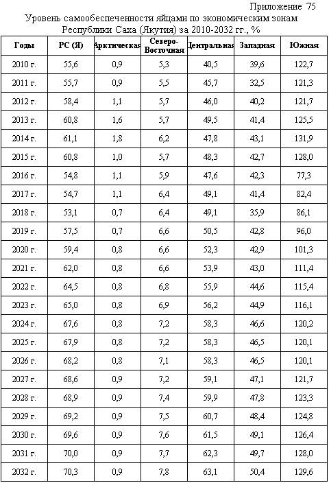 6. В 2032 г. прогнозные уровни самообеспечения мясом прогнозируются быть относительно равными (от 32 до 42,6%). Относительно молока показатели в разрезе экономических зон существенно отличаются. Так, по прогнозу в 2032 г. крайне необеспеченными молоком местного производства остаются Южная (2,8%) и Арктическая (3,4%) зоны. Уровни самообеспеченности яйцами по зонам при сохранении современного размещения сельского хозяйства прогнозируются быть так же не равномерными (Южная зона – 129,6%, Арктическая зона – 0,9%) (Таблица 71).