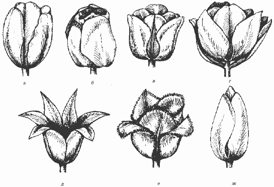 а – ранние немахровые; б – поздние немахровые; в – триумф; г – ранние махровые; д – лилиецветные; е – бахромчатые; ж – дарвиновы гибриды