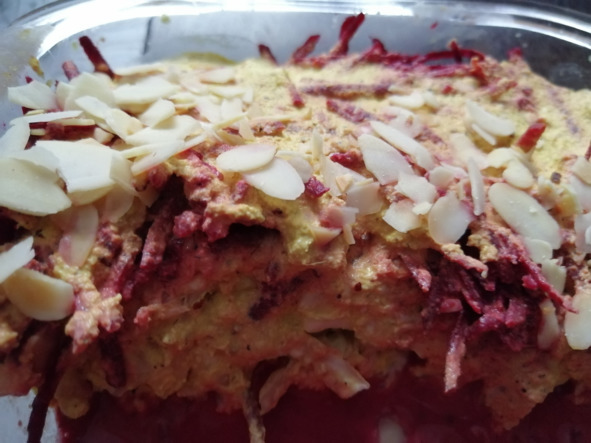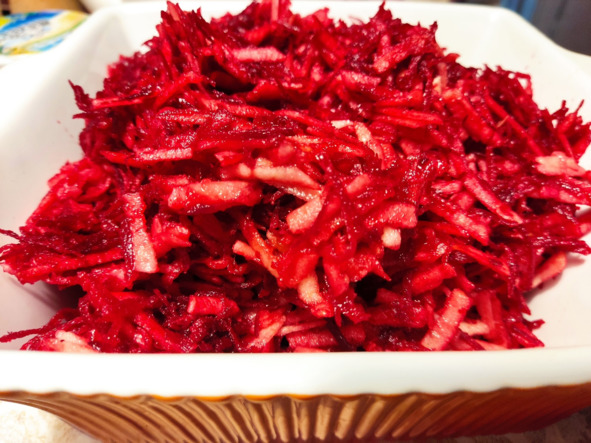 – Сырую свёклу натираем на мелкой тёрке или измельчаем в шинковке. Есть такие шинковки-овощерезки как мясорубка. Свёкла натирается за одну минуту и не мнётся. Поэтому свёкла на салат получается не такая мятая как на тёрке и не дает лишнего сока. Это делает салат на вкус сочнее.