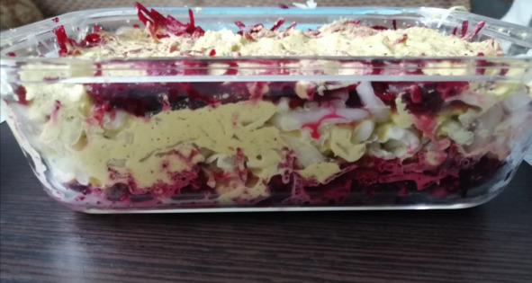 – Сделаем салат в 4 слоя – свёкла, лук, капуста, свёкла. Каждый слой будем промазывать соусом.