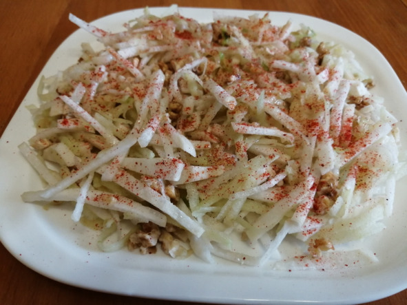 – Есть салаты, в которых редьку можно немного примять, тогда такой салат будет вкуснее. В этом салате редьку не мнём.