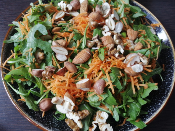 Если в салате используются орехи или семена, то их предварительно замачивают на ночь для того, чтобы активировать полезные свойства орехов и семян и убрать значительное количество фитиновой кислоты. А в растениях она содержится для того, чтобы защитить семена от несвоевременного прорастания. А для человека фитиновая кислота замедляет процесс переваривания семян.