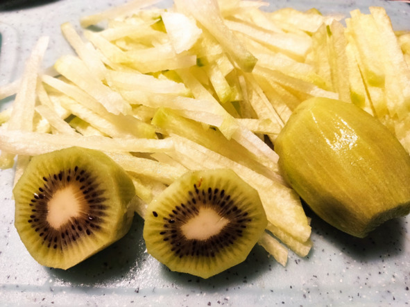 – Киви очищаем и нарезаем на мелкие кусочки.
