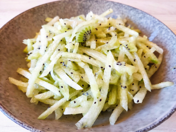 – Салат даст сок. Сок лучше слить (можно выпить), а салат выложить в миску. Можно сок не сливать, с соком будет еще вкуснее, потому что редька пропитается и будет как маринованная. Во многих восточных странах салат заправляется большим количеством лимонного сока и оливковым маслом, и едят такие салаты ложками. Потому наш салат из редьки и киви тоже можно есть ложкой.