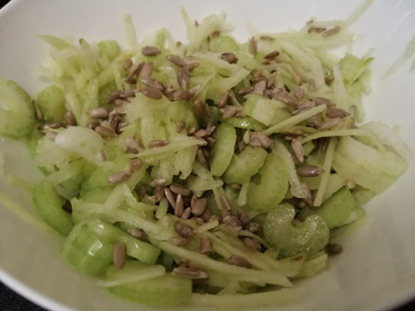 – Яблоко натираем на крупной тёрке и смешиваем с сельдереем.