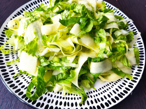 – Смешиваем кабачок и листья салата, добавляем масло, можно подсолить. Выкладываем на блюдо в виде гнезда.