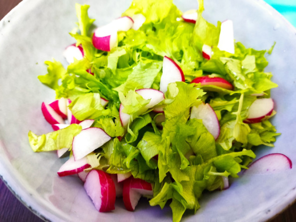 – Смешиваем листочки шпината, редьку, оливковое масло.