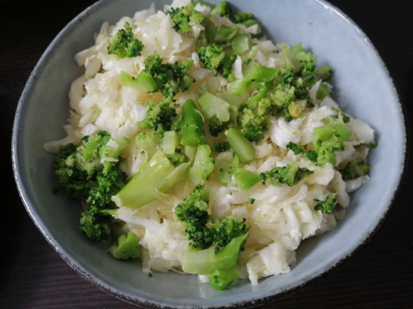 – Китайскую капусту нарезаем тонкой соломкой, немного помнём.