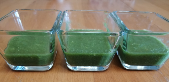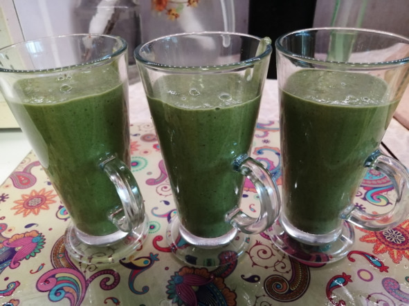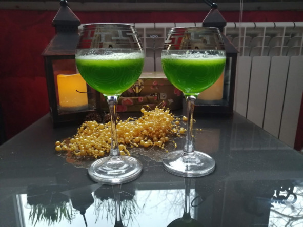 – Разливаем по красивым небольшим стеклянным рюмочкам, стаканчикам – чтобы был виден изумрудный цвет смузи.