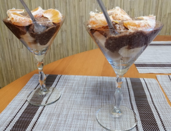 – Если вы уже готовите без сахара, то кэроб можно не добавлять. Тогда десерт получится менее сладким, сладость добавят фрукты – банан и мандарин.