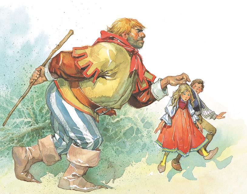 Однажды великан отправился на охоту. Долго бродил он в поисках дичи и вдруг увидел двух детей – мальчика и девочку. Брат и сестра собирали грибы и так увлеклись, что не заметили, как забрели в дремучий лес. Не раздумывая, великан схватил детей и понёс к себе домой. Ни слёзы, ни мольбы о пощаде не смягчили сердце злодея.