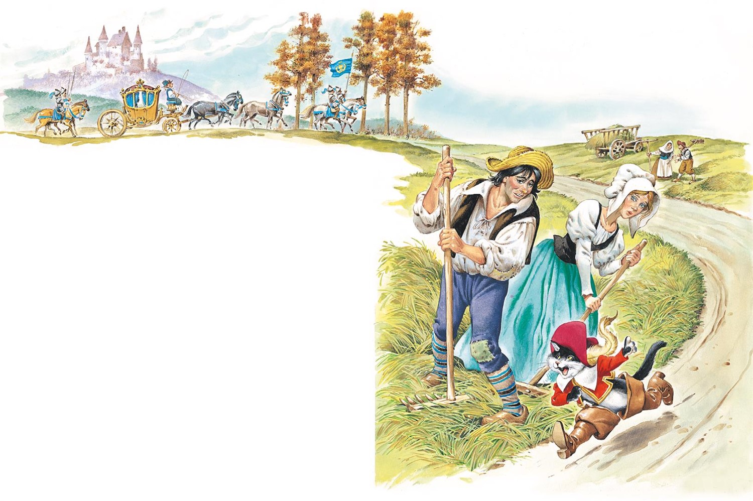 Королевская чета с удовольствием согласилась. Они усадили в карету юношу, ошеломлённого наглостью кота, и приказали трогаться. Кот со всех ног пустился вперёд. Пробегая мимо крестьян, работавших в поле или косивших траву на лугу, он кричал: