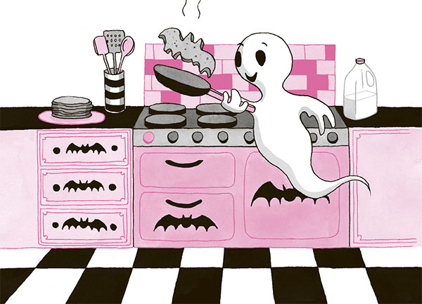Мы полетели вниз, в кухню. Я уселась за стол, а Оскар принялся делать оладушки в форме летучих мышек. Ему можно самостоятельно пользоваться плитой, потому что ему уже больше двухсот лет.