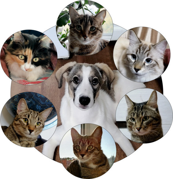 Дома у нас живут шесть кошек и собака. Кошачья семья создавалась постепенно – сначала появилась Раска, пушистая трёхцветная красавица кошка. Через определённое время у неё появился котёнок, Тиша.