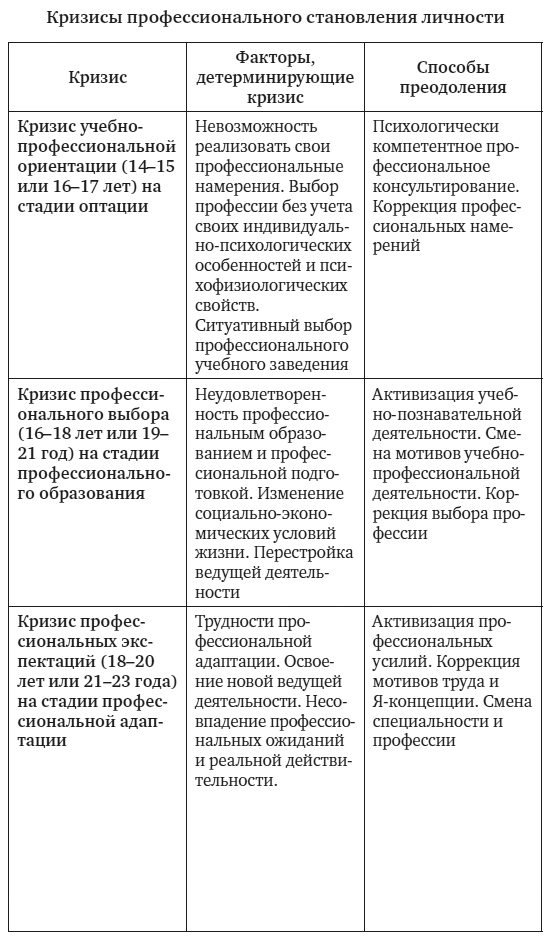 Противоречия между желаемой карьерой и ее реальными перспективами приводят к развитию кризиса профессиональной карьеры. Продуктивный выход из него – новаторство, изобретательство, стремительная карьера, социальная и профессиональная сверхнормативная активность. Деструктивные варианты разрешения кризиса – увольнение, конфликты, профессиональный цинизм, алкоголизм, создание новой семьи, депрессия.