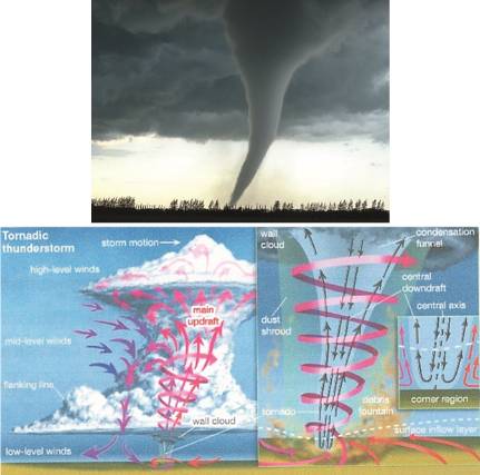 По определению газодинамики, торнадо – это сильный вихрь, распространяющийся к поверхности земли в виде огромного вращающегося столба или воронки. При достижении этой воронкой поверхности земли в ней создается точечная зона очень низкого давления, куда устремляются потоки приземного воздуха. Торнадо втягивает в себя все, что попало и затем быстро распадается.