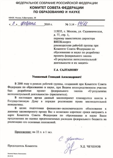 Результаты развития «аттрактора ИМЭ» получили поддержку и на высоком законодательном уровне. По предложению председателя Комитета Совета федерации профессора Чеченова Х.Д. была создана официальная Рабочая группа по законодательному обеспечению организации и развития инновационной деятельности в РФ, которую мне было предложено возглавить. Один из примеров государственной оценки деятельности этой группы – письмо председателя Комитета СФ с предложением о дальнейшем развитии, в том числе и финансовом обеспечении деятельности этой структуры при Совете Федерации РФ.