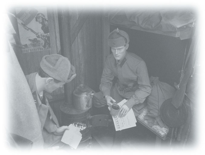 Рядом с полком проходила дорога, эта трасса Москва – Владивосток проходит и сейчас. А на другой стороне этой трассы тянулись болота, кочки такие. Среди этих кочек стояло несколько двухэтажных домиков барачного типа, нас поселили в одном из этих домиков. Семьи свои привезли и командир полка, и замполит, в общем, всё начальство. Они все были полковники, майоры. Отец имел звание старшины, но по своему положению художника в полку он больше общался с начальством, чем с простыми солдатами. Кроме того, всю войну он был политруком.