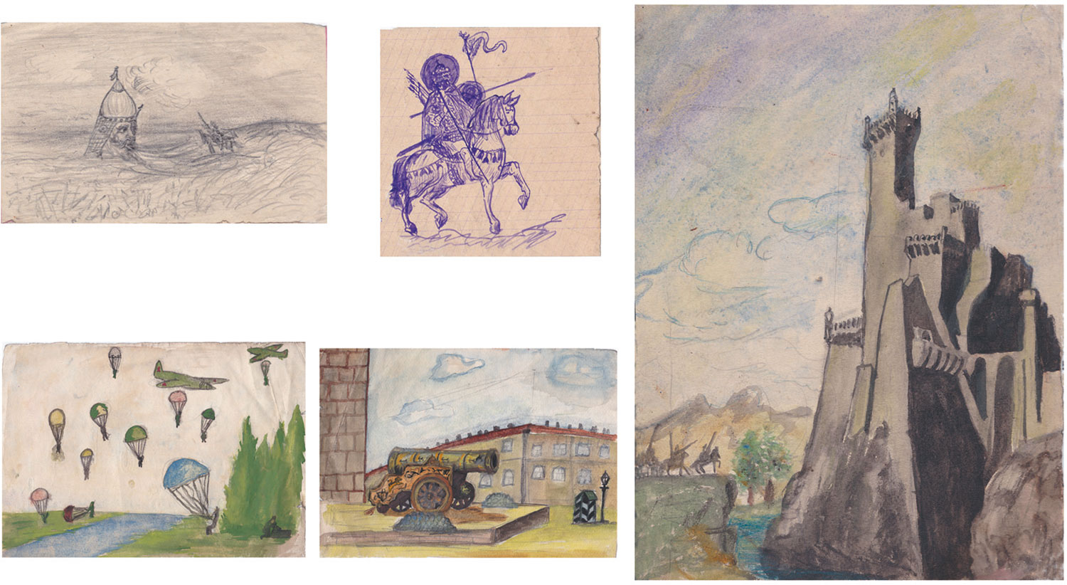А мать отцу на фронт часто посылала мои художества. Я тогда уже делал рисунки то про Кощея Бессмертного, то про Руслана и Людмилу, изображал, как Руслан на коне остановился на краю пропасти, и плащ у него развевается. А на другой стороне этой пропасти, на неприступной скале стоит замок Кощея Бессмертного. И там разные мечети громоздятся, церкви, ограда, ворота решётчатые, и на цепях подъёмный мост, который опускается и поднимается. И вот Руслан с копьём стоит напротив неприступного замка. На другом рисунке Руслан готовится к бою с Головой, в общем, детские такие сказки.
