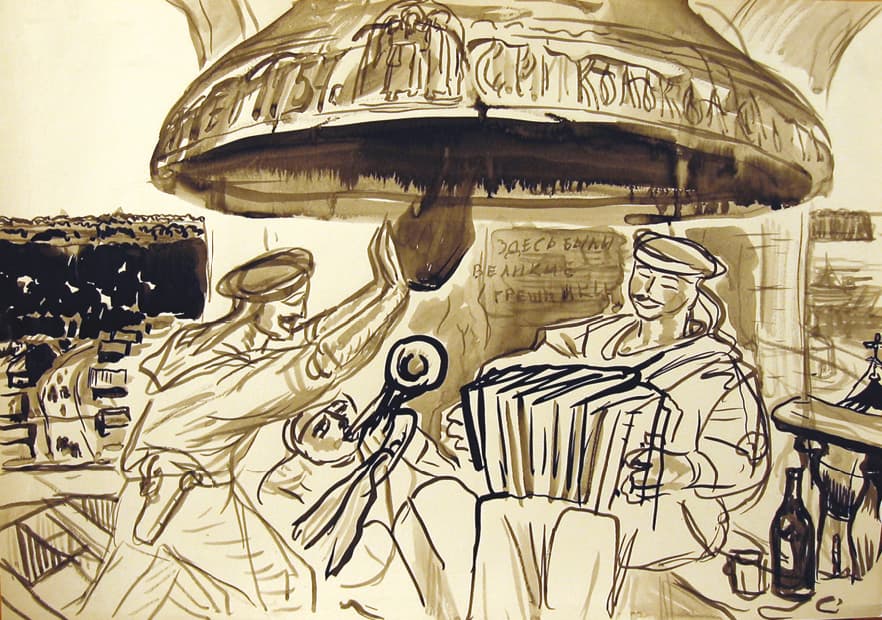 Таким образом, я сделал там пять рисунков вместе с портретом Серафимы Николаевны, но её портрет я никогда не показывал. Ещё я начинал рисовать портрет одного гармониста, который всегда играл там на крылечке (а другие инвалиды пытались танцевать), но натурщик попался неусидчивый. Мне казалось, что я смогу сделать хороший рисунок, но куда там – он минуты не сидел спокойно. Кроме того, со всей округи слетались голуби, садились ему и на плечи, и на руки, и на гармонь. А он только улыбался и продолжал играть в окружении этих голубей.