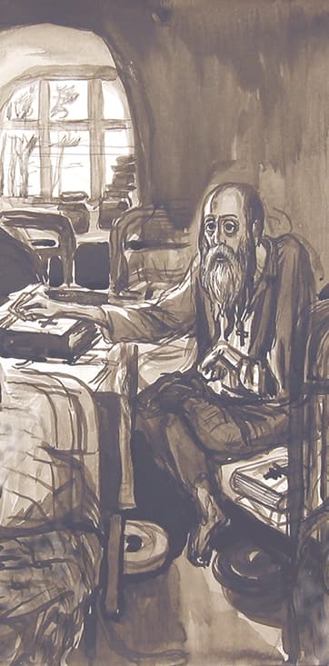 Мне всё хотелось попасть на Никольский скит в отделение, где находились психически больные инвалиды. Это было не так далеко от моей монастырской гостиницы, и я даже несколько раз подходил к этим мосткам на Никольский скит. Но директор Иван Иванович Королёв сразу мне сказал: туда тебе нельзя. – Я спрашиваю: почему нельзя, Иван Иванович? – А он отвечает: потому что там психически больные. Ты же рисуешь инвалидов войны? А они теперь стали просто психически больными инвалидами. (Я думаю – а разве психически больные не могут быть инвалидами войны?)