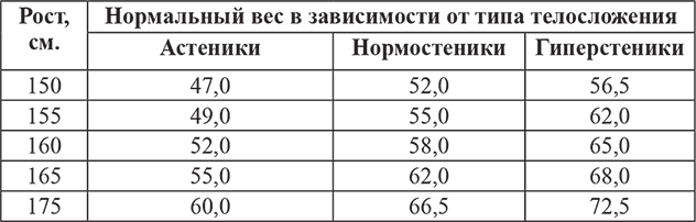 Показатели нормального веса по таблице.