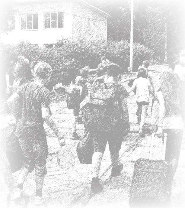 Шустряки из третьего отряда вывалили в коробку бананы из спортивной сумки. Теперь коробка наполнилась больше, чем наполовину, и ребята потащили её к кухне.