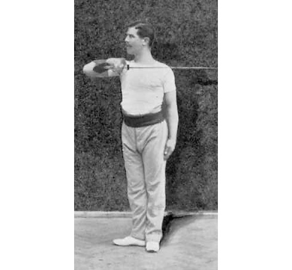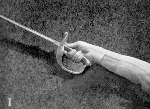 Возьмитесь за рукоять сабли так, чтобы последняя фаланга указательного пальца находилась приблизительно в полдюйма от гарды, а большой палец помещался сверху почти у гарды2. Верхняя часть рукояти должна опираться на нижнюю часть ладони и прижиматься к ее основанию так, чтобы немного выходить за ладонь, для обеспечения удобной «точки приложения» при управлении саблей, которое должно совершаться движением трех суставов руки по отдельности или в комбинации. Запястье следует изгибать только в боковом направлении, так как подвижность запястья может приводить к тому, что сабля отклоняется от направления удара или укола, а боковое движение запястья облегчает многие формы атаки (Рис. 1).