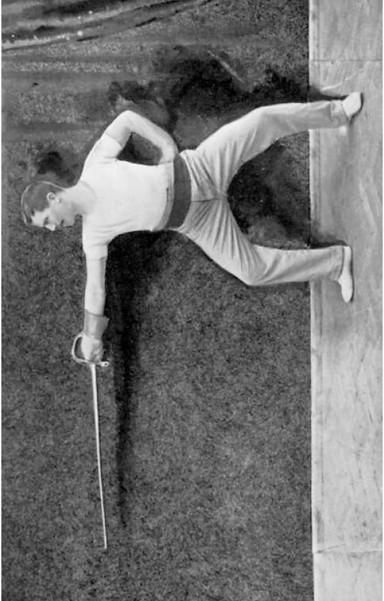 Равновесие должно сохраняться всегда, чтобы эффективнее противостоять эффекту от парирования противника и иметь возможность вернуться в защиту как быстро, так и точно. Из позиции «К бою», сохраняя левую ступню плотно прижатой к поверхности, выпрямить левую ногу, одновременно делая шаг правой прямо вперед на расстояние около 12 дюймов, правое колено перпендикулярно стопе, тело наклонено вперед, чтобы добавить силы и расстояния. Тело должно находиться на одной линии с левым плечом и левой пяткой. Рука и сабля удерживаются в положении «Вытянуть саблю». Ступни должны стоять на земле твердо и на всей стопе (рис. 6).