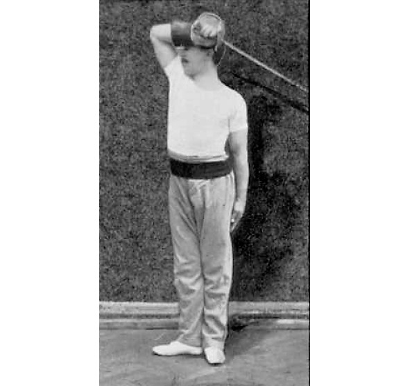 Из вышеуказанного положения поднимите саблю, полностью вытянув руку на уровне плеча, лезвие клинка вверх вправо, острие направлено в грудь противнику. Рука прямая, но не напряжена (рис. 4).