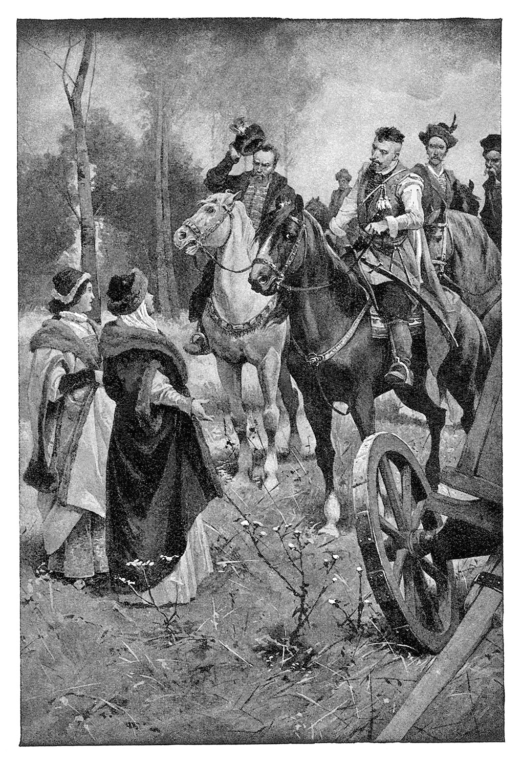 Посол снял соболий колпак, ибо, зная польскую речь, понял, о чем разговор, и тотчас же, как обходительный боярин, с любезным комплиментом поспешил предложить свои услуги, после чего велел сокольничему бежать за сильно отставшими телегами. Наместник между тем глядел на девушку, которая, смешавшись от пылкого этого взгляда, опустила очи долу, а барыня с казацкой внешностью на этот раз сказала вот что: