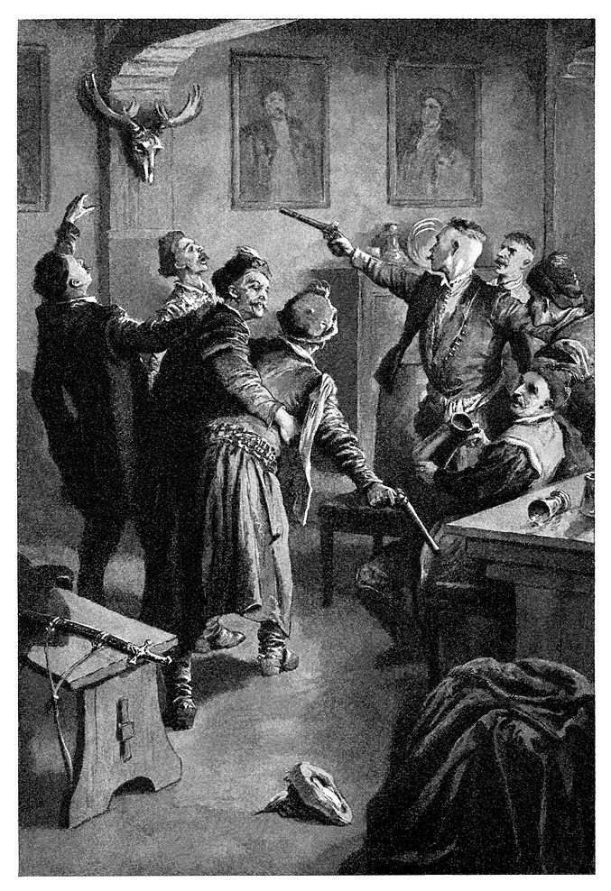 Повскакав с мест, друзья стали бить кулаками слуг по загривкам, чтобы те поторопились. Не прошло и четверти часа, как вся комната наполнилась громом выстрелов. Дым заслонил свет свечей и фигуры стреляющих. Грому выстрелов вторил голос Зенда, который кричал вороном, клекотал соколом, выл волком и ревел туром. Его ежеминутно прерывал свист пуль, летели обломки черепов, щепки от стен и рам портретов; в суматохе шляхтичи стреляли и по Биллевичам, а Раницкий, разъярясь, рубил портреты саблей.