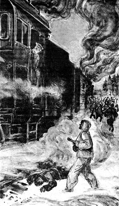 Из паровозной будки один за другим вылетели вниз головой два человека в зеленых немецких шинелях. Глухо ударившись о землю, они остались недвижимы. Вслед за тем выпрыгнул машинист. Набирая пригоршнями снег, он стал обтирать руки.