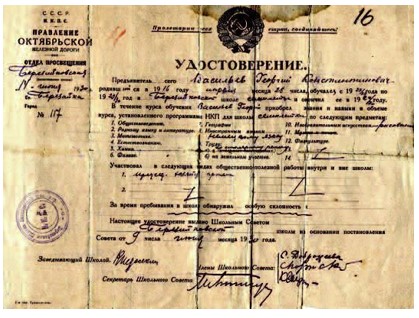 «В течение курса обучения Васильев Георгий приобрел знания и навыки в объеме курса, установленного программами НКП (народный комиссариат просвещения) для школы семилетки по следующим предметам: