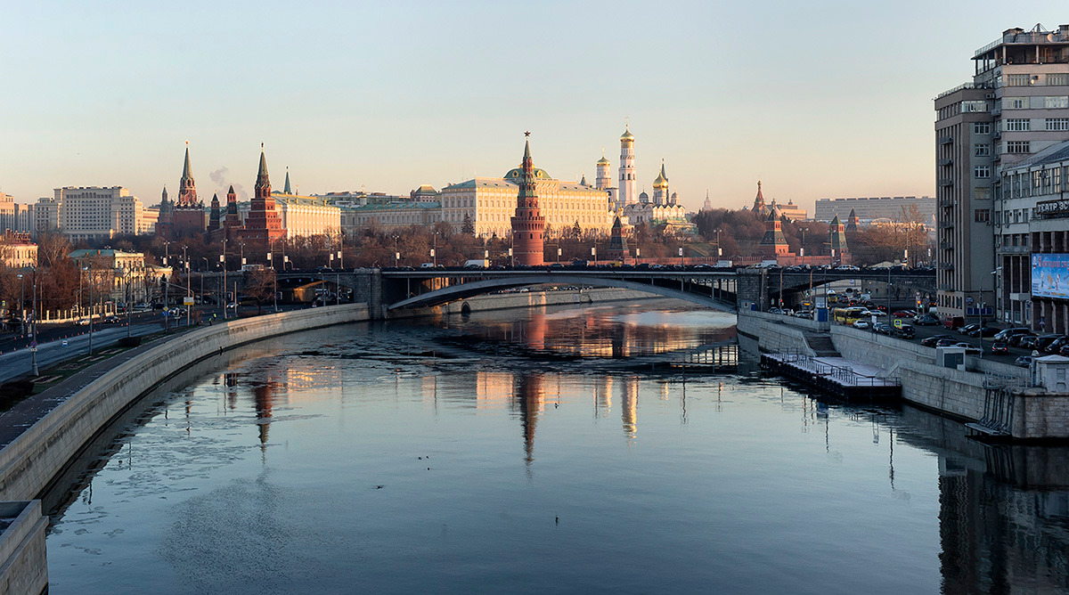 В середине декабря – время долгих ночей и поздних рассветов – около девяти утра солнце только-только лениво выползло на небосвод, окрасив нежно-розовым цветом фасад Большого Кремлевского дворца. В этот момент вид на кремль с пешеходного Патриаршего моста освещается боковым светом, но благодаря низкому утреннему положению солнца контрасты смягчены, нет провалов ни в тенях, ни в светах. Нет ветра, и потому вода зеркалит, но спустя несколько минут ветер появится и отражения растворятся. Легкая дымка городского смога высветляет дали, подчеркивая глубину пространства в кадре.