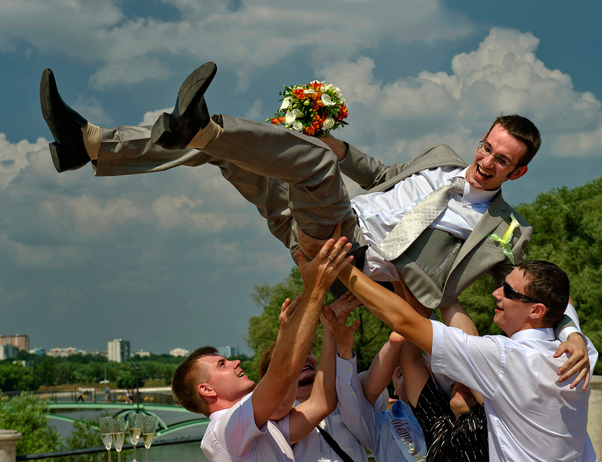 В разгар московского лета при смоге от горящих торфяников и довольно сильной облачности в середине дня, когда свет с трудом пробивался через самый короткий слой атмосферы, качали жениха. При этом до матрицы фотоаппарата добиралось максимальное количество ультрафиолетового излучения. Свет рассеивался кучевыми облаками, но синяя составляющая в освещении все-таки очень заметна. Если присмотреться к затененным белым поверхностям, это становится очевидным – они окрашены в синие и фиолетовые тона, благодаря чему краски в тенях выглядят слегка грязноватыми и выбеленными. В пленочные времена, когда снимали на слайд, полуденная сиеста была мертвым временем для пейзажистов. Снимали только в том случае, если охотились за возможностью передать особое состояние природы – полуденность. Я же снимал потому, что у меня выбора не было. При обработке пришлось столкнуться с заметной синюшностью кожи персонажей и подкорректировать этот дефект, причем отдельно исправлялись кожа и одежда.