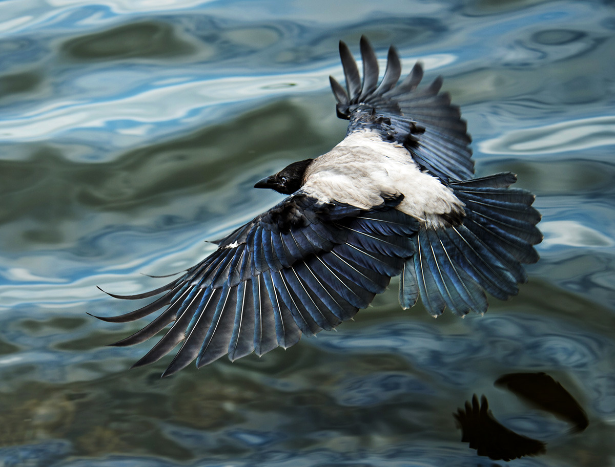 Июль. Час пополудни – время синюшных и разбеленных кадров, которое для цветной фотографии противопоказано. Снимал потому, что была довольно сильная облачность, свет казался мне рассеянным, не синим. Кроме того, хотелось проверить на деле усовершенствованный следящий автофокус новой камеры. Он действительно оказался очень быстрым. Ворону я снял навскидку, да еще и вслепую. Летящую птицу рассмотреть невозможно, слишком быстро мелькают эти создания перед глазами. Зато в процессе обработки увидел много интересного. Серая ворона оказалась вовсе не серой, а почти синей, словно бы металлизированной. Обычно мы видим птиц снизу на фоне неба, при таком освещении ни о каком цвете и говорить не приходится. Но на сей раз я стоял на пригорке и снимал ворону сверху в момент посадки, когда она распустила все свои закрылки для торможения. Обратите внимание на перья левого крыла – они наполовину серые, наполовину синие в зависимости от угла, под которым зеркальная поверхность перьев обращена к небу. Если угол падения и угол отражения совпадут с дырой в облаках, фотоаппарат запечатлеет синее перо. А если перо отразит серое облачное подбрюшье, то и цвету взяться будет неоткуда. Впрочем, и фон, сам по себе бесцветный, окрасится в полном соответствии с законом отражения света: угол падения равен углу отражения. Мораль этой истории проста – серые вороны серы только тогда, когда вокруг все серое.