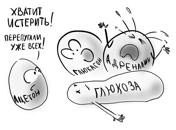 …жир. Из-за низкого уровня глюкозы в крови наша жировая ткань поднимает тревогу и начинает подкидывать в печень дрова – жир. Тот не просто течет в печень, как вязкая желтая река. Нет. Его сначала где-то там, на периферии, ломают «об колено», как сухую палку, и в топку летят уже обломки жира – жирные кислоты и глицерин. Из всего это добра хозяйственная мама-печень напечет много глюкозы и кетоновых тел вроде ацетона. Раз дома нечего есть, мама-печень научит наши голодающие ткани и органы питаться вонючим ацетоном. Ну приправит там его чем-то, поуговаривает, в лобик поцелует, и голодные внутренние органы нехотя начнут этот ацетон жевать. А что, нормально. Есть можно. Глюкоза там же где-то будет. Хоть мало – но будет.