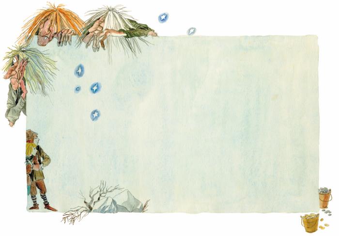 Один из троллей сложил руки трубой и крикнул через реки и горы, чтоб она поскорей принесла в Хедальский лес два стальных лука и два полных ведра серебра и золота.