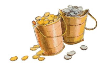 Мальчики набили мешки золотом и серебром, вскинули за плечи стальные луки и, прихватив новые вёдра из блестящей меди, весело зашагали домой.