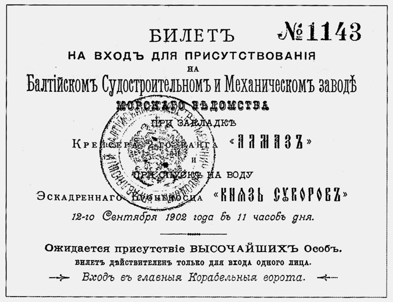 12 сентября 1902 года на Балтийском судостроительном заводе в высочайшем присутствии торжественно провели спуск на воду эскадренного броненосца «Князь Суворов» и закладку крейсера 2-го ранга «Алмаз». К 11 часам утра там собрались сотрудники управлений Морского министерства: генерал-адъютант П. П. Тыртов, начальник Главного Морского штаба, вице-адмирал Ф. К. Авелан и другие морские чины. В 11 часов на завод прибыла королева эллинов Ольга Константиновна с королевичем Христофором. Королеве при встрече преподнесли роскошный букет цветов. В 11 часов 10 минут на яхте «Александрия» прибыл из Петергофа под своим брейд-вымпелом Николай II. После торжественного спуска на воду эскадренного броненосца «Князь Суворов» император совершил церемонию закладки крейсера «Алмаз» на открытом стапеле Балтийского завода. Приняв закладную серебряную доску, Николай II изволил собственноручно окрасить суриком специальное гнездо, заложить в него своеобразный паспорт крейсера и даже символически расклепать одну из четырех раскаленных заклепок, соединяющих крышку с корпусом закладной ниши.