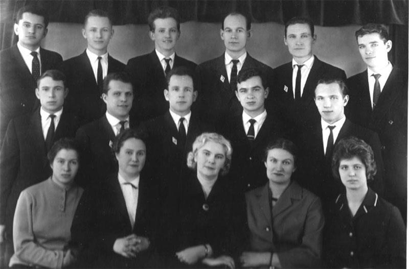 Преподаватели и выпускники группы интенсивного изучения английского языка. Первый ряд: И. Магнус, Н. Д. Грачёва, И. П. Олейникова, Л. А. Худякова, Н. Данилова. Второй ряд: С. Александров, А. Шутов, В. Купцов, В. Ларин, В. Тутов. Третий ряд: А. Львович, А. Королёв, В. Клюквин, Ю. Рябичев, С. Астреин, Е. Островский