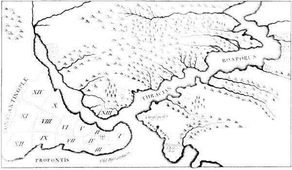THE Sycene Ward, which is commonly called Galata, or Pera, ought more properly to be called the Peræan Ward. Thus it is that Josephus calls Judæa, because it lay on the other Side of the River Jordan: And thus it is, that Strabo calls that Part of the Countrey which lies on the other Side of Euphrates. The Reason alledg’d by the Inhabitants, why ’tis call’d Galata, is, as they tell you, (being impos’d upon by the Allusion of the Name) that Milk was formerly sold there: And I make no Question of it, did they but know, that Galata was formerly call’d Sycæ, they would derive its Name from the Word Fig; and pretend to justify their Mistake from the Authority of Dionysius their Countryman, who says, that it was originally call’d Sycæ, from the Fairness and Abundance of that Fruit which grew there. But their Conjectures had been grounded upon a better Foundation, if they had deriv’d the Name of Galata from the Galatæ, back’d by the Authority of Johannes Tzetzes (a Citizen of Constantinople, and a very industrious Grammarian) in his Var. Hist. written above four hundred Years ago. This Author tells us, that Brenus a Gaul, and Commander in Chief of the Gauls, whom the Greeks call Γαλάται, pass’d over the Sea from thence to a Place of Byzantium, and that this Place for this Reason was call’d Pera, which was after their Arrival call’d Galata. This Place is seated partly on a Hill, and partly on a Plain at the Foot of it. This Hill is enclosed on the East and West by two Valleys, each of which is about a Mile in length. The Ridge of the Hill shoots from North to South, and is in no Part of it less than two hundred Paces broad, and of equal Length with the Valleys that enclose it, and joins to the Plain upon the Continent. The South Side of this Hill, and the Plain below it, is bounded by the Bay of Ceras, which makes it almost a Peninsula of a semicircular Figure, in the Form of a drawn Bow, with this Difference only, that the Western Point of it is larger by half; and not quite so long as the Eastern. Galata, as ’tis enclos’d with a Wall, is four Thousand and four Hundred Paces in Compass. It varies, in many Places, as to its Breadth. In the middle of the Town ’tis six hundred Paces broad. The Bay and the Walls stand at twenty Paces Distance. The Plain that runs between the Bay and the Hill, is a hundred and eighty, and the Hill it self four hundred Paces broad. The Eastern Side of Galata, at the first Entrance of it, is four hundred Paces in breadth; after which it contracts it self into the Breadth of two hundred and sixty Paces only. The Western Side of it, which stands without Old Galata, rises upon a moderate Ascent, which winds Southward, and adjoyns to a small Descent, which terminates Westward near the Walls of Old Galata. The Town therefore of Galata stands upon a Treble Descent; one of which winds from North to South, another falls Easterly, and another at West. The Declivity which crosses the Breadth of it, stretches from North to South; and is so steep, that in many Places you are forced to climb it by Steps; so that you ascend the first Floor of the Houses, which stands upon a Level, by Ladders. The Eastern and Western Side of Galata have a double Declivity; one from North to South, the other to East and West; so that not only those Parts of it which lie in a strait Line, but those Ways also which are winding, or lie Cross-ways, have their Descents; but the Eastern Side of the Town is more upon the Declivity than the Western Side of it. To be short, Galata is of such a Steepness, that if all the Houses were of an equal Height, the upper Rooms would have a full View of the Sea, and of all the Ships sailing up and down in it. And not only Galata, but almost the whole City of Constantinople would have the same Privilege, if that Law, which was first made by Zeno, and afterwards ratify’d by Justinian, was in full Force. This Law expressly forbids any Man to hinder or obstruct an open and entire View of the Sea, or indeed a Side Prospect of it, and enjoyns the Inhabitants to build at least at a hundred Paces Distance from it. The Level Part of the Town, which runs between the Bottom of the Hill and Bay, is, in no Place of it, less than two hundred Paces broad. Towards the Ends of it ’tis much broader; and, in some Places, it widens to the Length of five hundred Paces. The Town is thrice as long as it is broad. It extends it self in Breadth from North to South, in Length from East to West. The Western Side of it is broader than the Eastern, and almost of an equal Breadth with the middle of the City. For in a Length of five hundred Paces, ’tis no less than five hundred Paces broad. The Eastern Side of Galata is more narrow, where it is no more than two hundred and sixty Paces broad. The Shore round the Town is full of Havens. Between the Walls and the Bay is a Piece of Ground, where are Abundance of Taverns, Shops, Victualing-houses, besides several Wharfs, where they unlade their Shipping. It has six Gates, at three of which there are Stairs, from whence you sail over to Constantinople. Galata is so situate to the North of Constantinople, that it faces the first, second, and third Hills, and the first and second Valley of that City; having in Front the Bay of Ceras, and Constantinople, and behind it some Buildings of the Suburbs. For many of these Buildings stand partly on the Top of the Hill, and partly on the Sides of it. The Town, it self does not rise to the Ridge of the Hill. Where Galata rises highest, there is yet standing a very lofty Tower, where there is an Ascent of about three hundred Paces, full of Buildings, and beyond that is the Ridge of the Hill upon a Level, about two hundred Paces broad, and two thousand Paces long. Thro’ the middle of it runs a broad Way full of Houses, Gardens, and Vineyards. This is the most pleasant Part of the Town; from hence, and from the Sides of the Hill, you have a full View of the Bay of Ceras, th