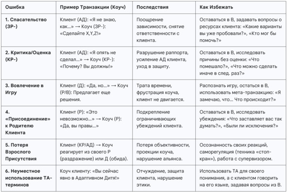 o Пересекающиеся транзакции: Если клиент часто «пересекает» Взрослые вопросы коуча, отвечая из АД (страх, «не знаю», оправдания, жалобы, бунт) или из КР (самокритика, обвинение других, обесценивание коучинга), это сигнал для коуча. Это может указывать на:
