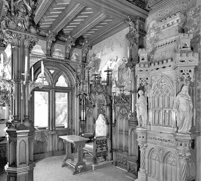 Рис. 2. Спальня баварского короля Людвига (XIX век), оформленная картинами из истории Тристана и Изольды. Замок Нойшванштейн. Одна из таких картин видна справа на стене. Взято из Интернета.