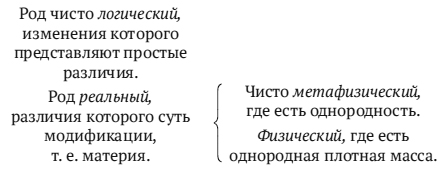 Епископ Ворчестерский мог бы прибавить к этому, что из того, что общая субстанция содержится в теле и в духе, не следует вовсе, будто их различия представляют собой модификации одной и той же вещи, как говорит наш автор в приведенном мной отрывке из его первого письма. Следует тщательно различать между собой модификации и атрибуты. Способности обладать восприятием и действовать, протяжение, плотность представляют собой атрибуты, или постоянные и основные свойства; мышление же, стремительность, фигуры, движения представляют собой модификации этих атрибутов. Мало того, следует проводить различие между физическим (или, правильнее, реальным) родом и логическим (или идеальным) родом. Вещи, относящиеся к одному и тому же физическому роду, или однородные, состоят, так сказать, из одной и той же материи и могут часто быть превращены друг в друга путем изменения модификации; таковы круги и квадраты. Но две разнородные вещи могут иметь общий логический род, и тогда их различия не являются простыми случайными модификациями одного и того же субъекта или одной и той же метафизической или физической материи. Так, время и пространство – вещи весьма разнородные, и было бы ошибочно представлять себе какой-то общий реальный субъект, который обладал бы непрерывным количеством вообще и модификации которого образовали бы время и пространство. Быть может, найдутся люди, которые станут издеваться над этими философскими различениями двух родов, одного – чисто логического, другого – реального, и двух материй, одной – физической, материи тел, другой – чисто метафизической, или общей, как если бы сказали, что две части пространства состоят из одной и той же материи или что два часа тоже состоят из одной и той же материи. Однако эти различения не чисто терминологические, а коренятся в самих вещах и, мне кажется, очень уместны в данном вопросе, где смешение их породило ложные выводы. У этих двух родов имеется общее понятие, а понятие реального рода общо обеим материям, так что генеалогия их такова: