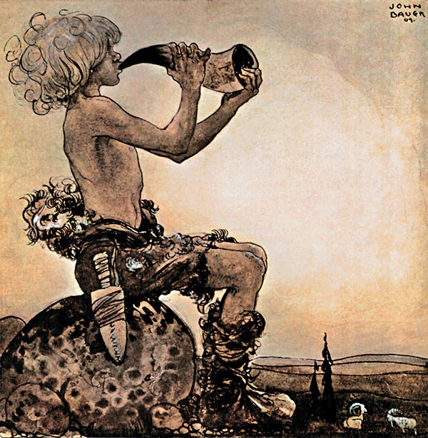 А под утро пришёл на Горбатую гору Вилле-Пастух, чтобы отогнать коз Друла на пастбище. Увидал он, какая беда приключилась со старым троллем, взял ножницы и быстренько состриг шерсть со всего стада. Перво-наперво обмотал он тёплой мягкой шерстью голову Друла – боль сразу утихла, и тролль успокоился. Затем пастух законопатил шерстью все щели и дыры в каменных стенах, так что ветры не могли больше разгуливать в горных пещерах, как им вздумается, и им пришлось играть в свои игры снаружи. А уладив всё, Вилле заиграл весёлую мелодию на своей дудочке и повёл стадо на пастбище. Козы почувствовали облегчение – им не надо было больше таскать тяжёлые шубы – и на радостях скакали до небес.